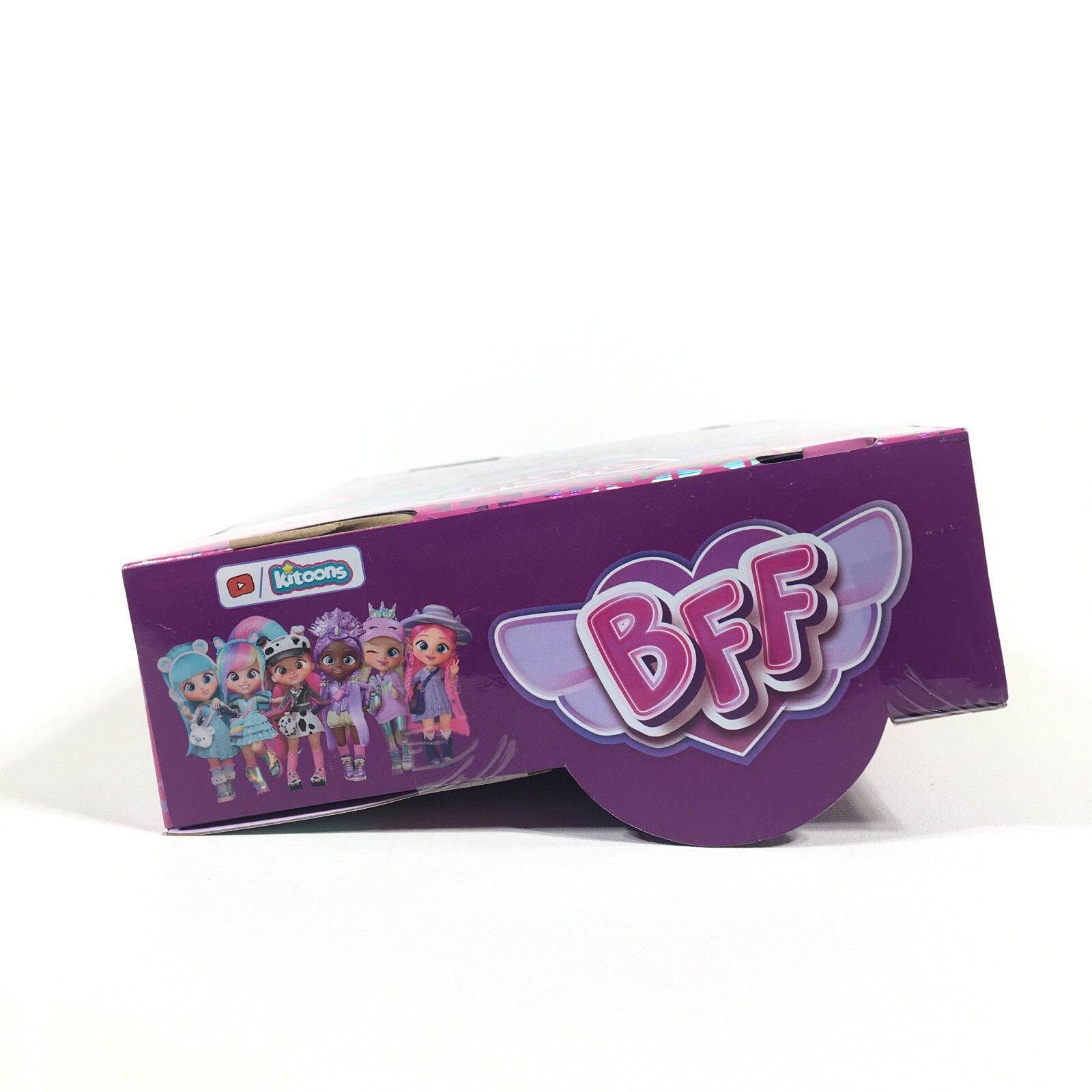 BFF Muñeca Katie BFF ¡Conoce a la nueva CB BEST FRIENDS FOREVER, Katie! ¡Ahora tus personajes favoritos de los Bebés Llorones Lágrimas Mágicas han crecido y son adolescentes! Katie tiene 13 años y vive muchas aventuras junto a sus BFF. Hay 6 personajes para coleccionar, todos visten con ropita de moda. ¡Katie tiene el pelo largo de nailon, ojos de cristal y el cuerpo articulado! ¡Gira el cilindro para encontrarla! Abre el packaging y descubre su armario con más de 7 sorpresas: 2 prendas de ropa, un bolso, una diadema o un sombrero, unos zapatos a juego con calcetines o medias y ¡un collar!