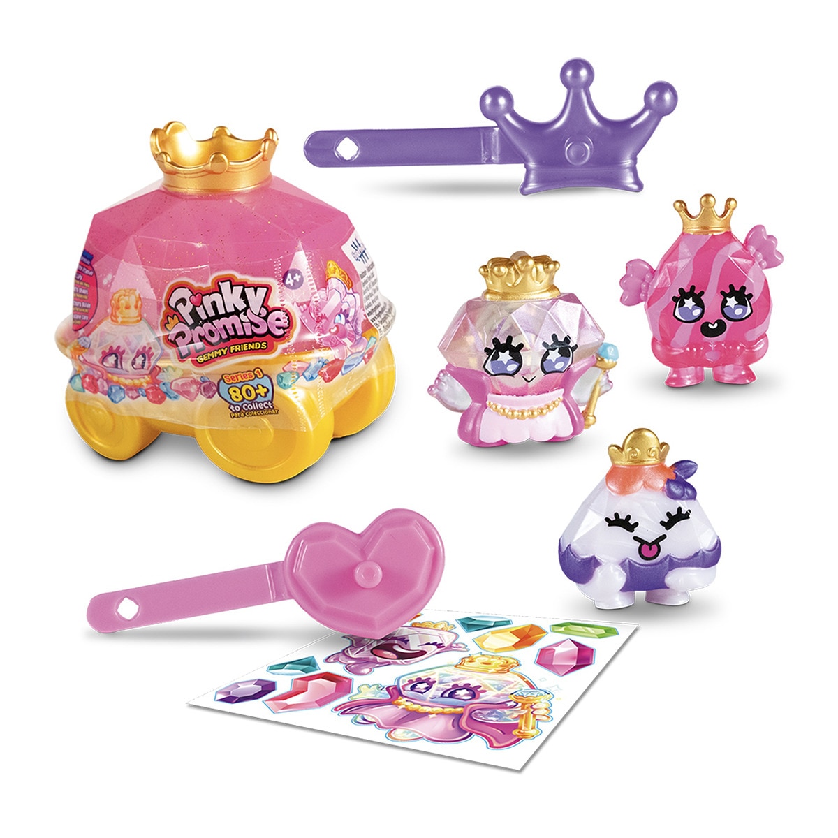 Bizak Carroza Real Pinky Promise Carroza sorpresa con hasta 84 personales para coleccionar, 6 de los personajes son especiales, 2 de ellos exclusivos y 1 de ellos es únicoEstas figuras son usables ya que se pueden poner en diferentes joyas como anillos, pinzas de pelo?. Las figuras miden 3 centímetros.El carro además de poderse utilizar como joyero, es apilable. Cuando abres la carroza real veras un cartón donde podrán jugar también en el con las figuras.