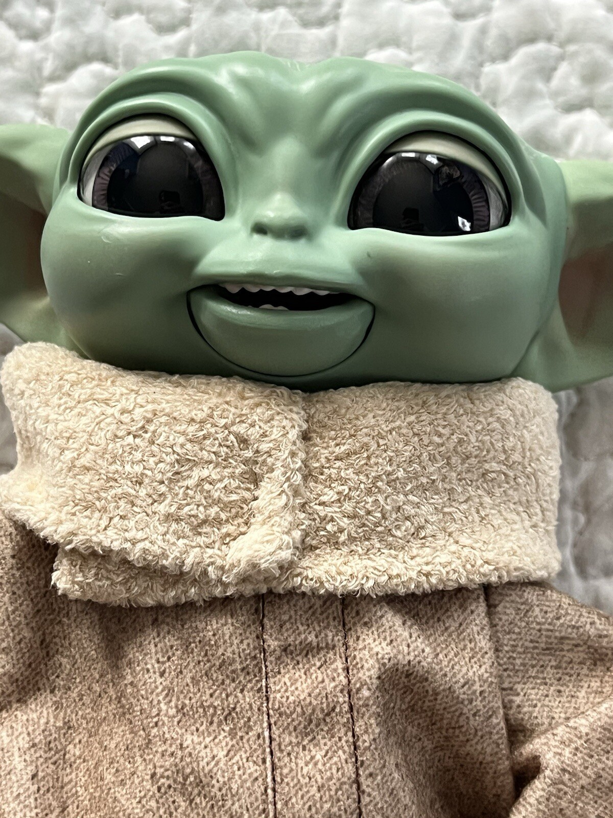 Hasbro Animatronic Baby Yoda Grogu El niño The Mandalorian Star Wars Descripción¡El Niño puede caminar, levantar las manitas y beber de su cuenco!ACCESORIOS INTERACTIVOS: El juguete animado Galactic Snackin' Grogu viene con 4 accesorios interactivos (bol con tentáculos, galleta, pomo de palanca y cuchara) que, al colocarlos en su mano, activan efectos de sonido y movimientos.