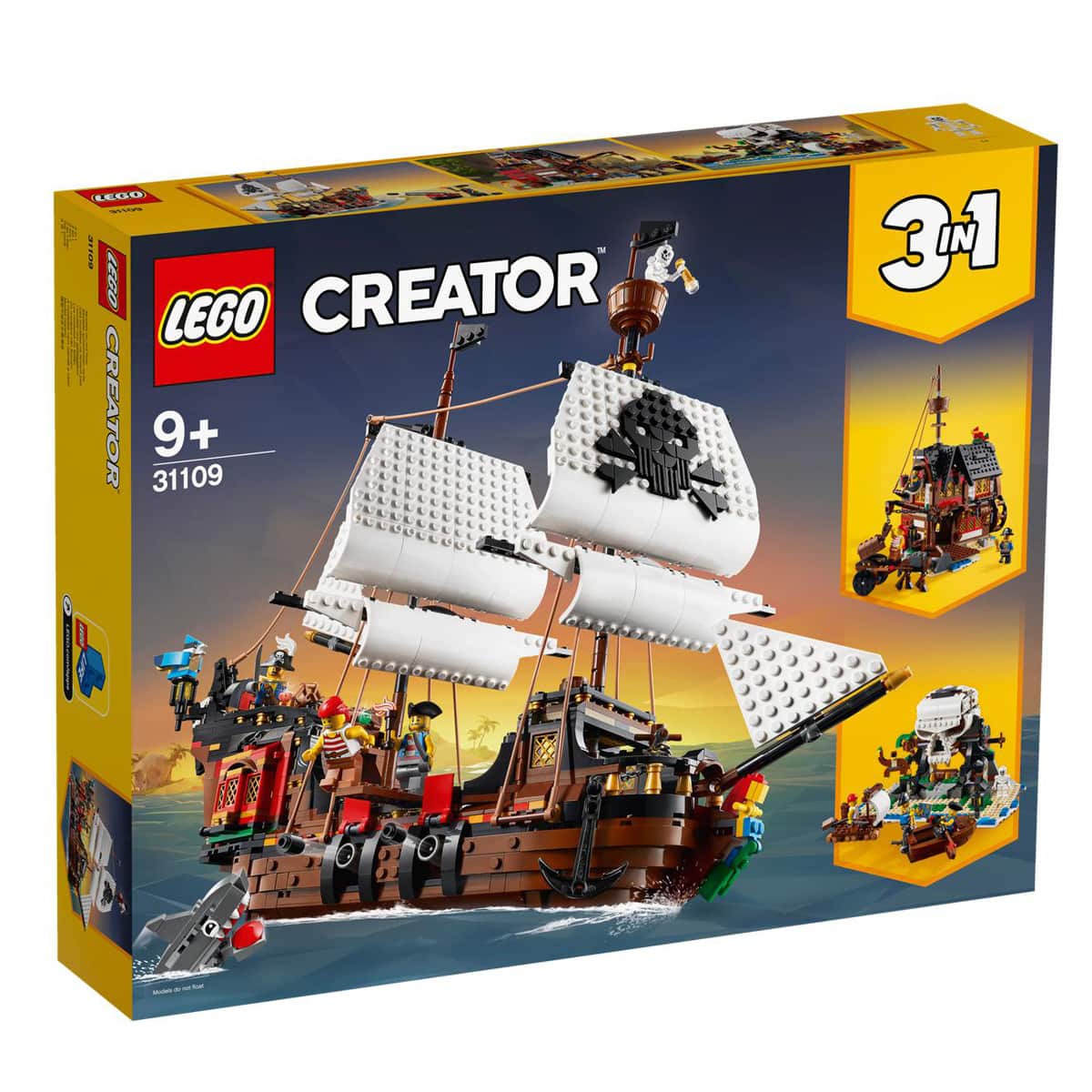 LEGO Juguete de Construcción Creativo Barco Pirata, Taberna o Isla Calavera LEGO Creator 3en1 Descripción¡A los fans de los piratas les esperan increíbles aventuras con este juguete de construcción LEGO Creator 3en1 Barco Pirata (31109)! Este formidable y detallado set para niños de 9 años en adelante cuenta con un barco pirata de juguete con velas móviles, ancla, cañones y camarote con techo y laterales que se abren, ¡y puede transformarse en la divertida isla calavera o en una taberna pirata llena de acción!Este set de construcción permite a los peques construir 1 de los 3 modelos cada vez y experimentar divertidas historias en ellos. A la isla calavera podrán llegar en pequeñas barcas y tendrán que seguir el mapa del tesoro para encontrar el cofre que se esconde dentro de la cueva en forma de calavera. La taberna que se abre a la mitad, esconde divertidos accesorios para construir con ladrillos LEGO y funciones. Para aún más diversión se incluyen 3 mini figuras LEGO de piratas y la figura de un esqueleto, además de animales como un loro y un tiburón de juguete. Los peques podrán seguir estas maquetas para construir o simplemente ser creativos e imaginar y crear todo aquello que se les pase por la mente.Nada más abrir la caja de este juguete 3en1 da comienzo la diversión construyendo y reconstruyendo. Con claras y fáciles instrucciones, el montaje es sencillísimo para los peques, que disfrutarán de una gratificante experiencia de construcción y toneladas de diversión. Es un fascinante regalo de Navidad, cumpleaños o en una ocasión especial para niños amantes de los juegos creativos.El Barco Pirata mide aproximadamente 37 cm de alto, 46 cm de largo y 19 cm de ancho.Contiene 1264 piezas.¡Advertencia! Riesgo de asfixia. Partes pequeñas y bolas pequeñas. No apto para niños menores de 3 años.Contiene 1264 piezas.