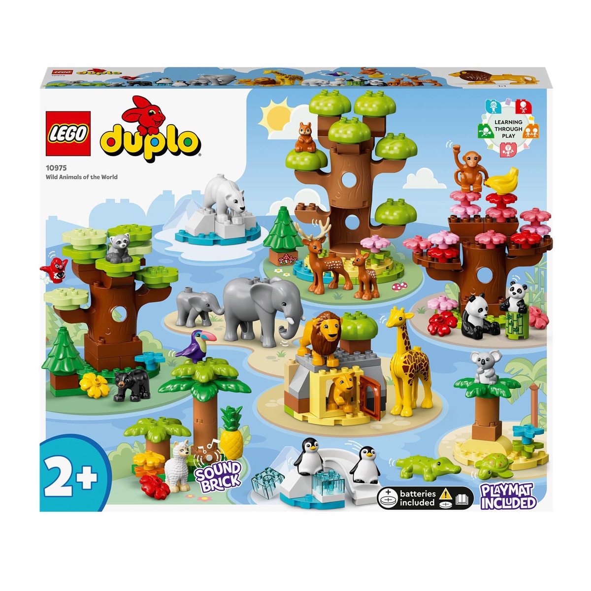 LEGO Juguete Educativo Fauna Salvaje del Mundo Mapamundi con Sonido y Figuras de Animales LEGO DUPLO DescripciónLleva a los niños en edad preescolar en un increíble viaje alrededor del mundo para conocer los 7 continentes y sus criaturas más características. Este set LEGO DUPLO Fauna Salvaje del Mundo (10975) con 22 animales de juguete y sus hábitats naturales, está repleto de detalles de gran realismo y oportunidades de juego y aprendizaje para niños de entre 2 y 5 años. Con este juguete educativo los peques podrán descubrir pandas en Asia, ciervos en Europa, una alpaca en Sudamérica, un oso en Norteamérica, un koala en Australia, pingüinos en la Antártida, leones de juguete en África? ¡y mucho más! Cuenta con un escenario de juego decorado con un mapa terrestre y un ladrillo de sonido LEGO DUPLO (batería incluida) que reproduce voces de animales y ambientes sonoros. Las posibilidades de juego con este set DUPLO grande, ¡son infinitas!Este divertido mapamundi infantil le da la oportunidad a los peques de aprender sobre geografía mientras juegan con las adorables figuras de animales LEGO DUPLO incluidas. Desarrollando habilidades motrices finas para la vida, los peques compartirán con sus padres bonitos hitos del desarrollo. Es un gran regalo de cumpleaños o de Navidad para todos esos niños que amen la naturaleza y los animales.El escenario de juego decorado con un mapamundi mide aproximadamente 99 cm de ancho y 50 cm de profundo. La sección europea mide aproximadamente 25 cm de alto, 20 cm de ancho y 17 de profundo.Contiene 142 piezas.